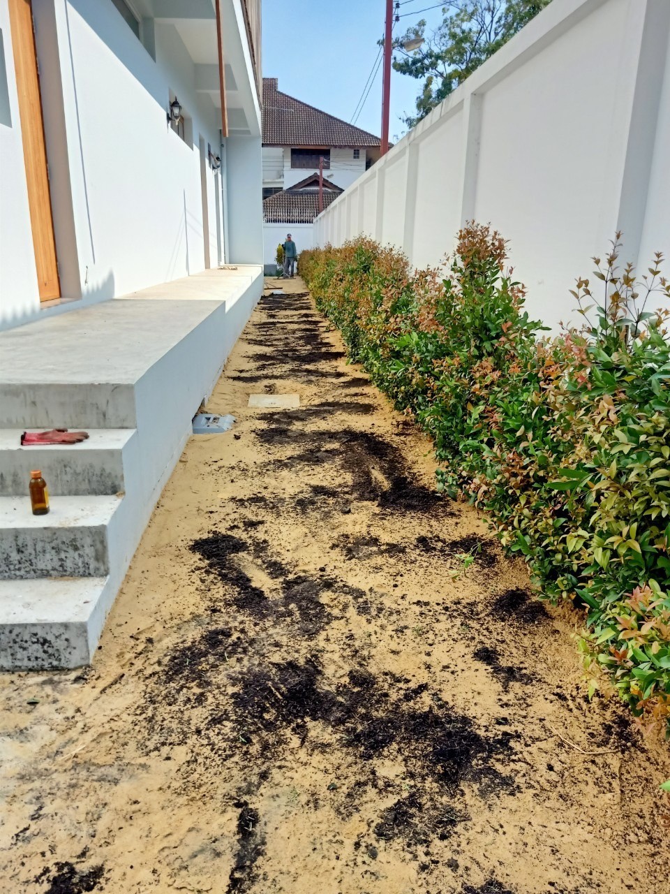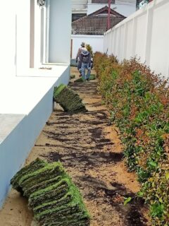 - นำดินปุ๋ยมาว่านให้ทั่วบริเวณที่จะปูหญ้า